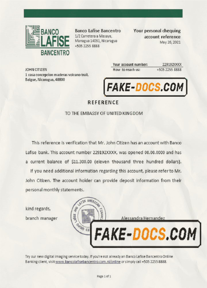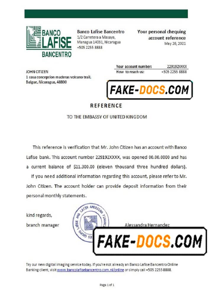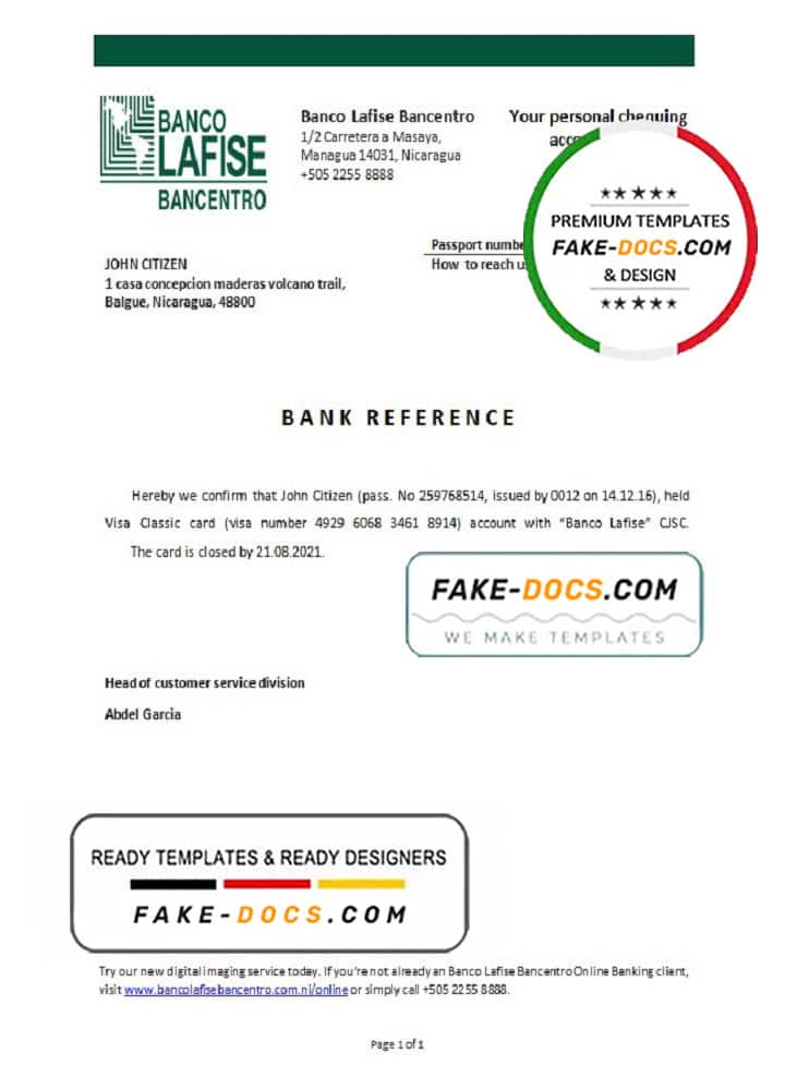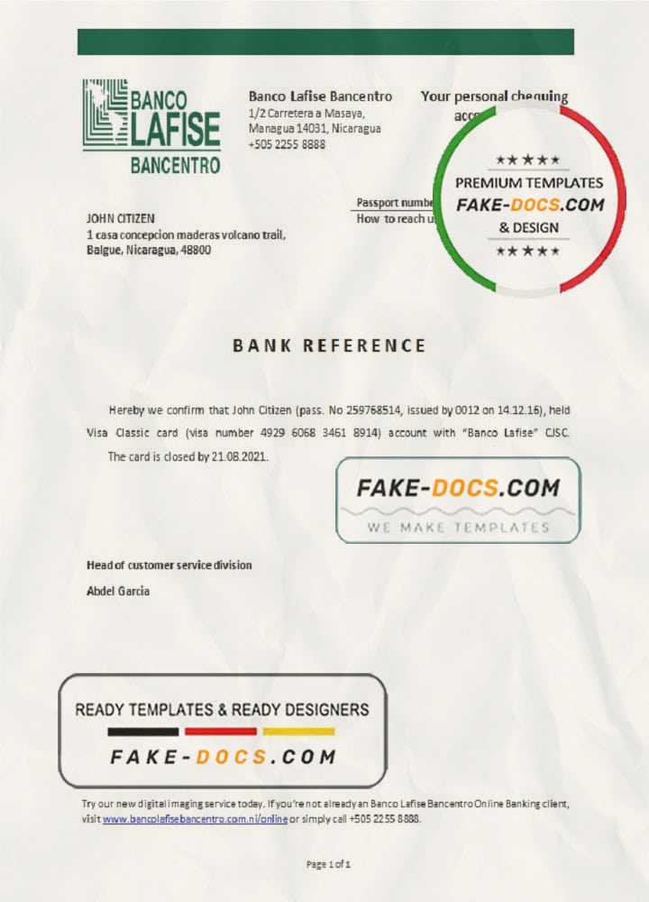 Nicaragua Banco Lafise Bancentro bank account reference letter template in Word and PDF format