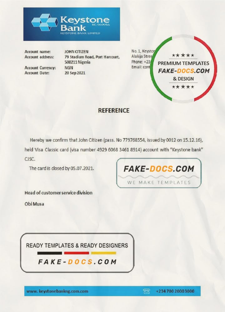 Nigeria Keystone Bank bank account reference letter template in Word and PDF format