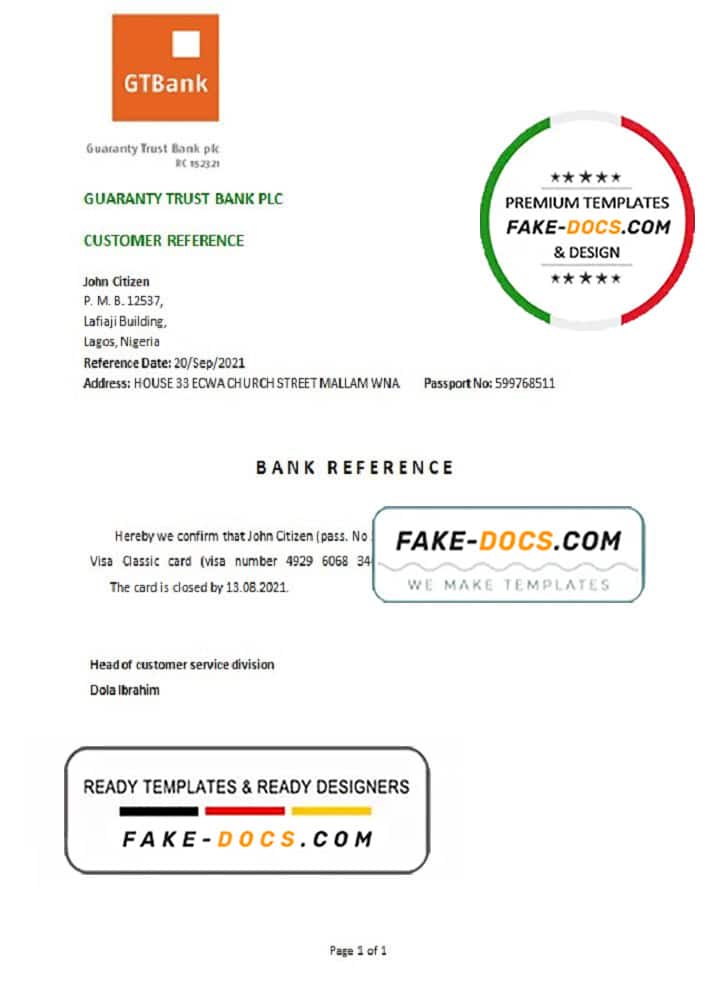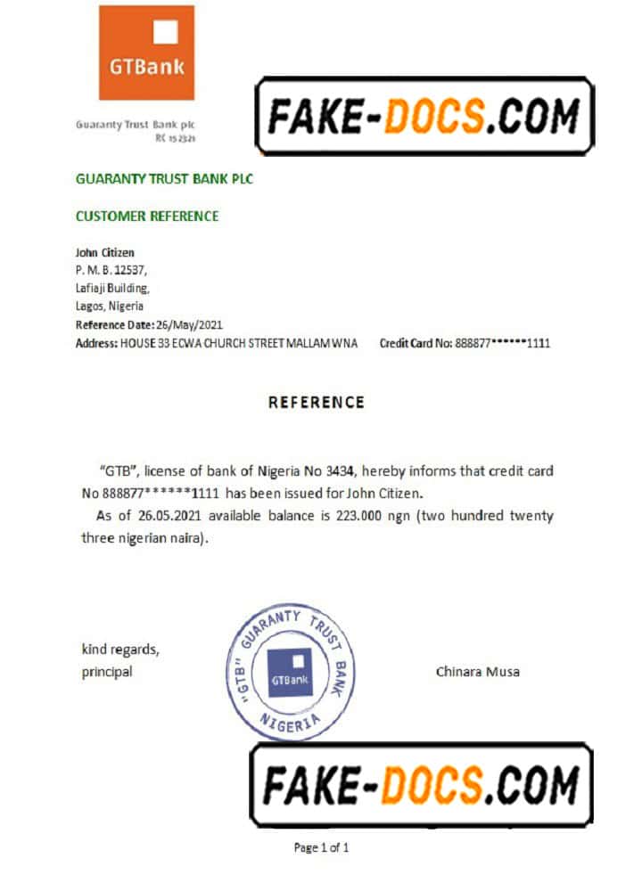 Nigeria GTBank bank account reference letter template in Word and PDF format