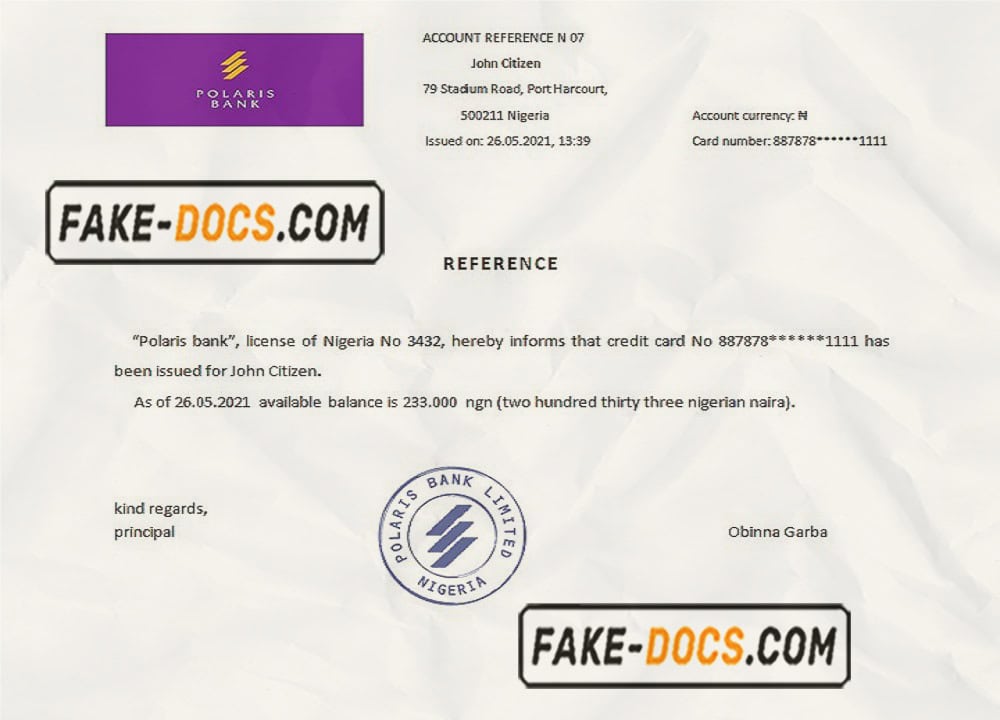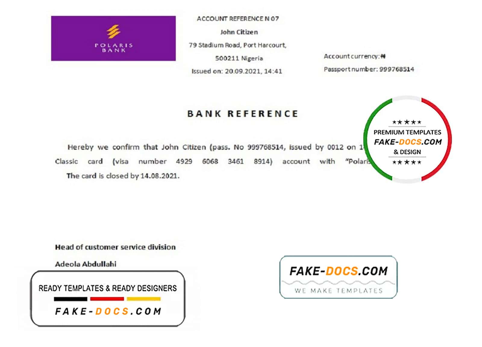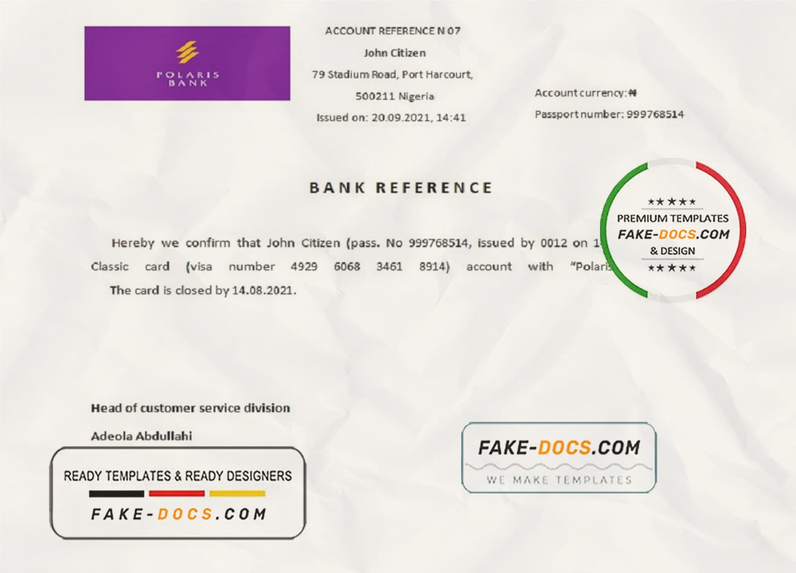 Nigeria Polaris Bank bank account reference letter template in Word and PDF format