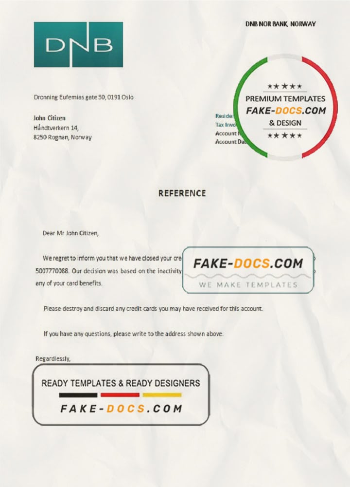 Norway DNB Nor Bank bank account closure reference letter template in Word and PDF format