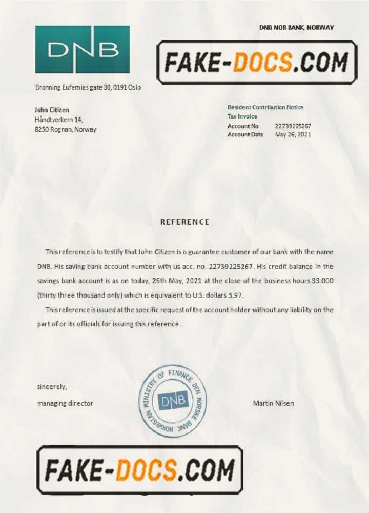 Norway DNB Nor Bank bank account reference letter template in Word and PDF format