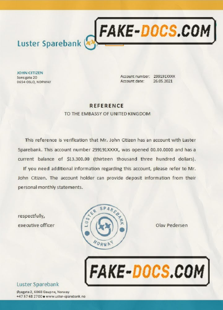 Norway Luster Sparebank bank account reference letter template in Word and PDF format