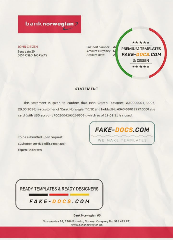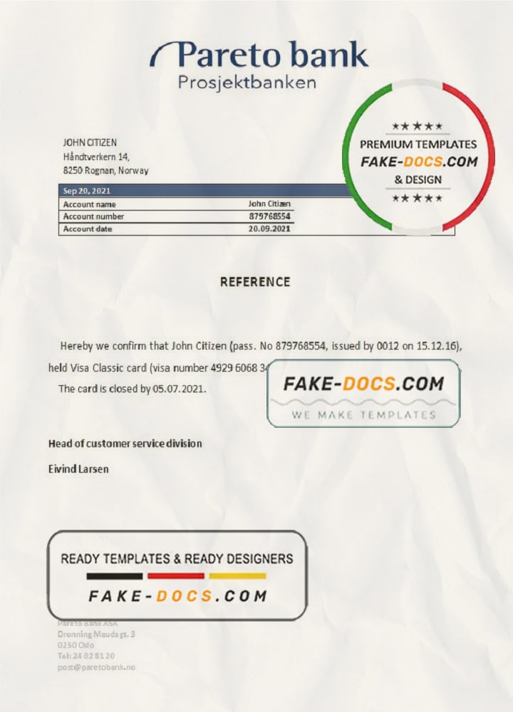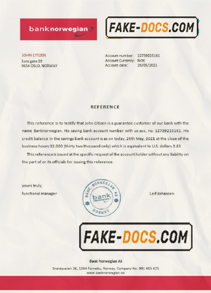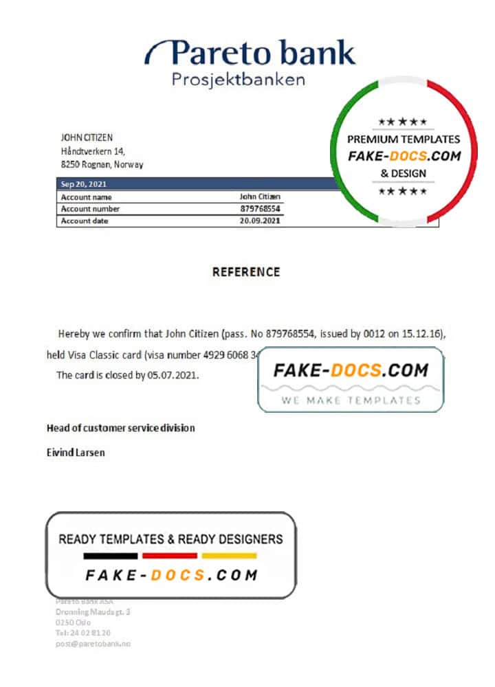 Norway Bank Norwegian bank account reference letter template in Word and PDF format