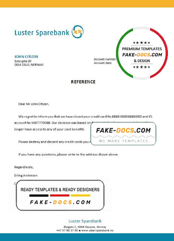 Norway Luster Sparebank bank account closure reference letter template in Word and PDF format