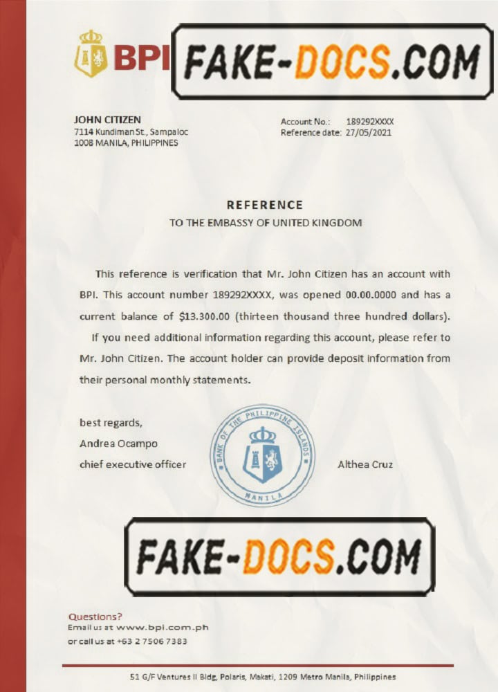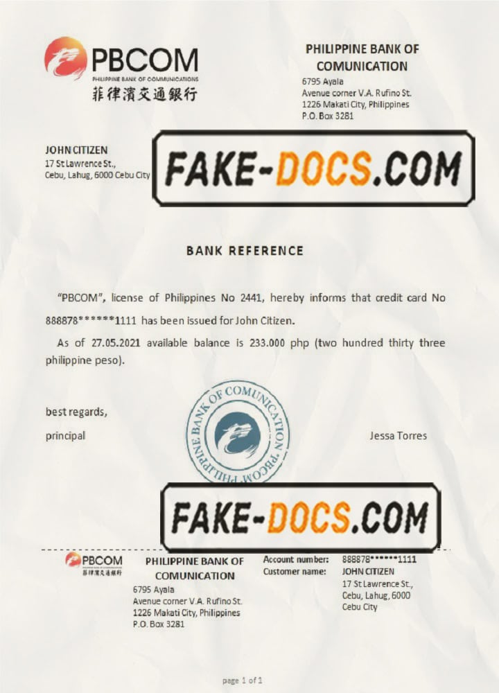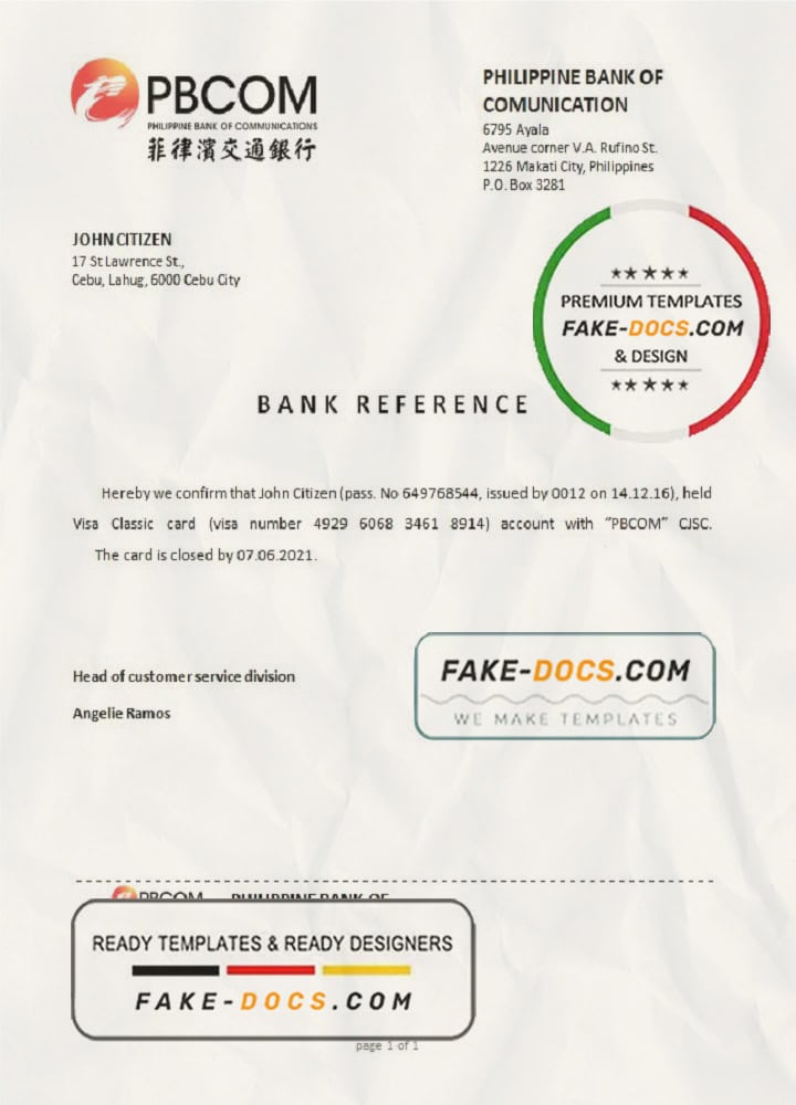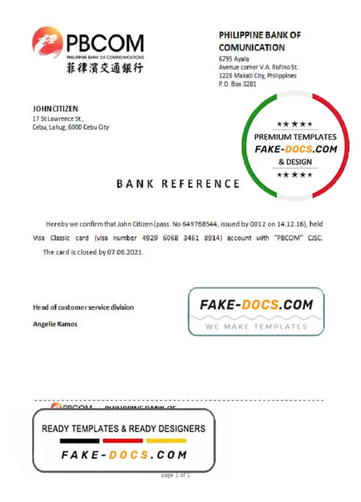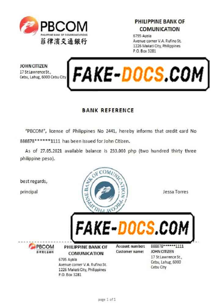 Philippines Pilippine Bank of Comunication bank reference letter template in Word and PDF format