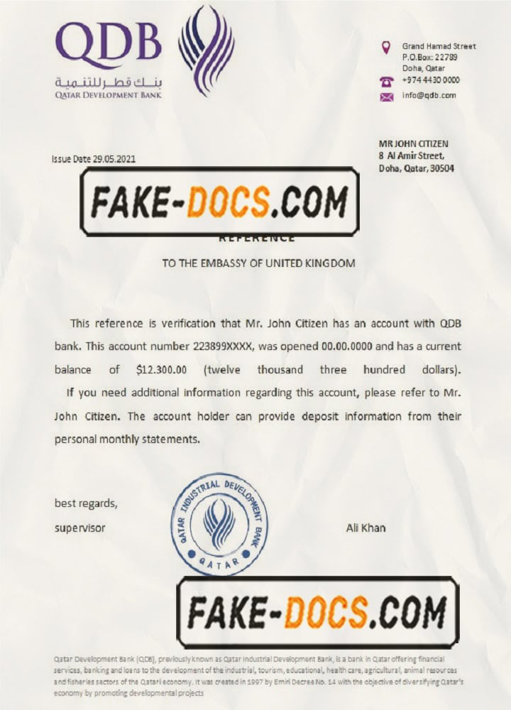 Qatar Development Bank bank account reference letter template in Word and PDF format