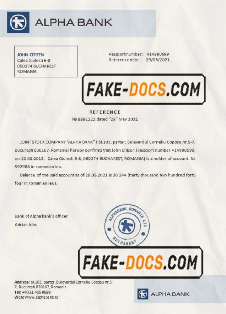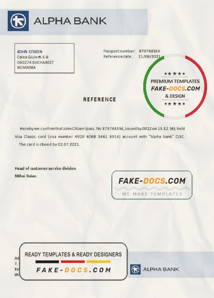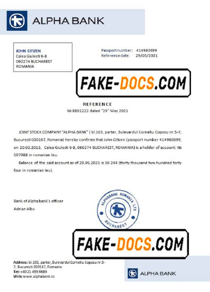 Romania Alpha Bank bank account reference letter template in Word and PDF format