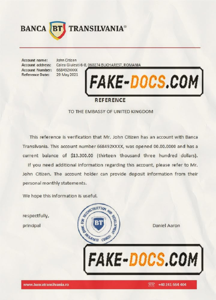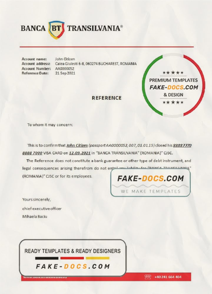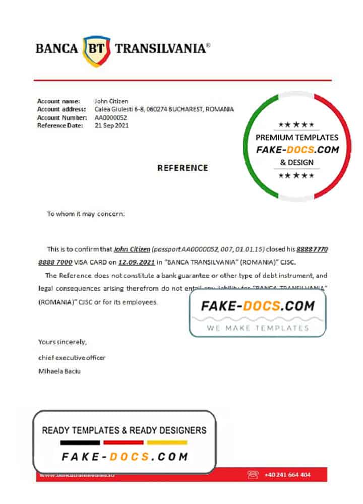 Romania Banca Transilvania bank account reference letter template in Word and PDF format
