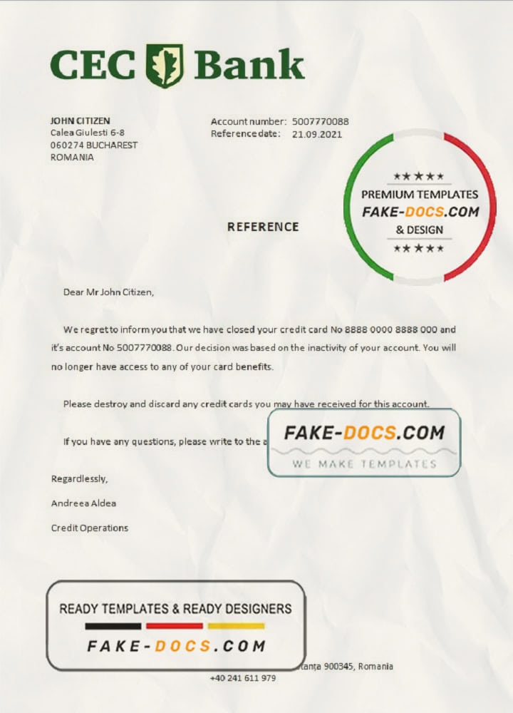 Romania CEC Bank bank account closure reference letter template in Word and PDF format
