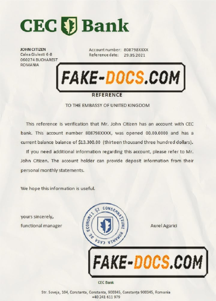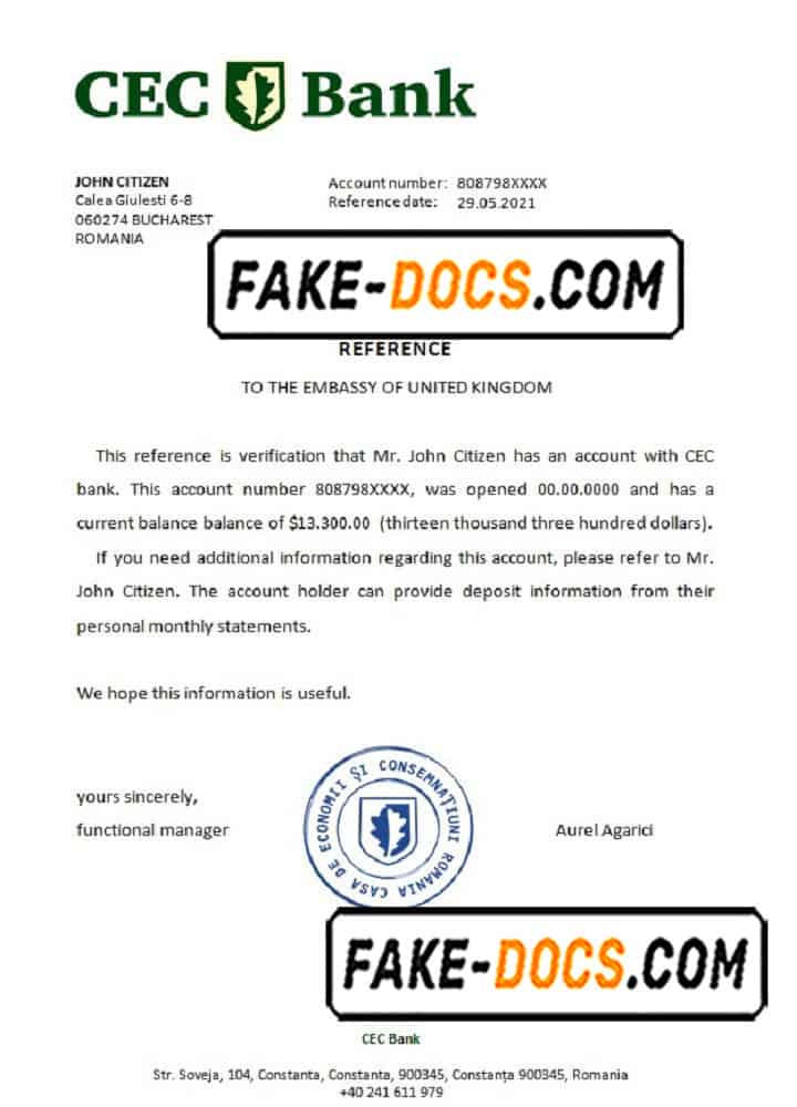 Romania CEC Bank bank account reference letter template in Word and PDF format