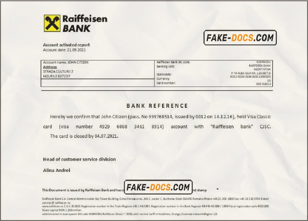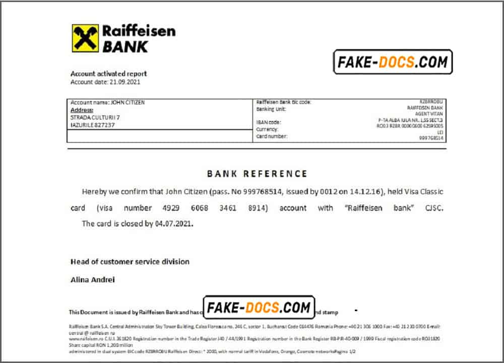 Romania Raiffeisen bank account closure reference letter template in Word and PDF format