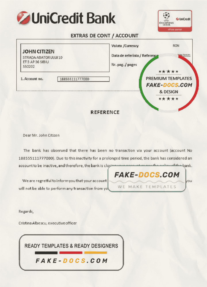 Romania UniCredit Bank bank account closure reference letter template in Word and PDF format