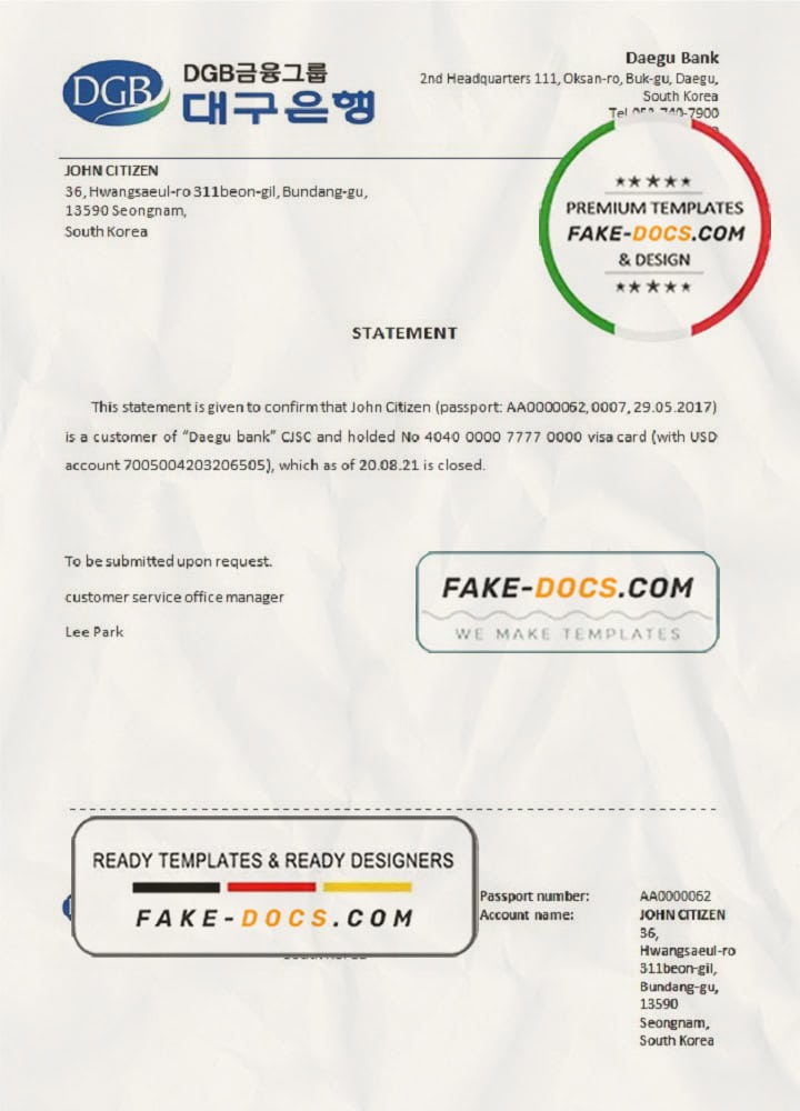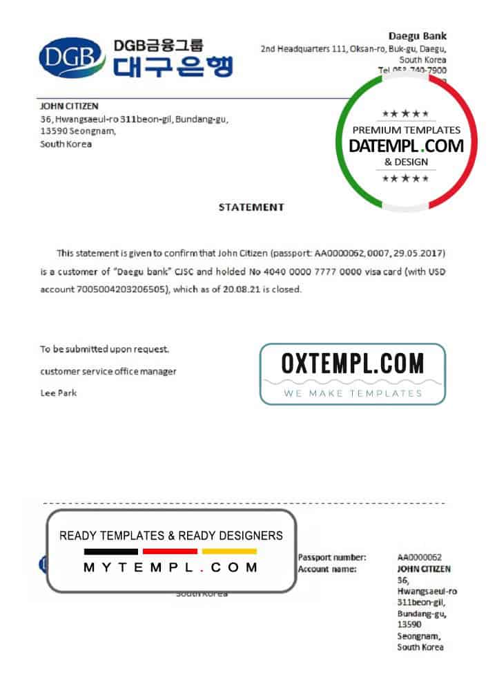South Korea DGB Bank bank account closure reference letter template in Word and PDF format