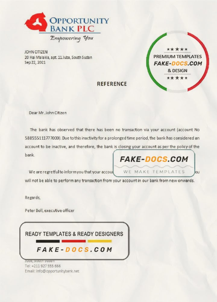 South Sudan Opportunity Bank bank account closure reference letter template in Word and PDF format