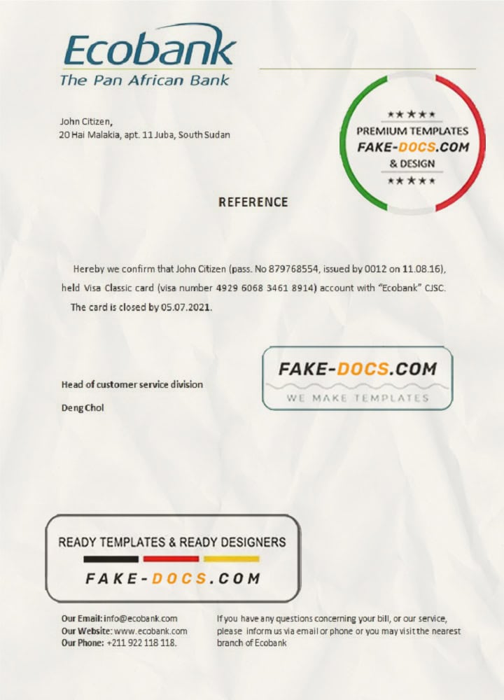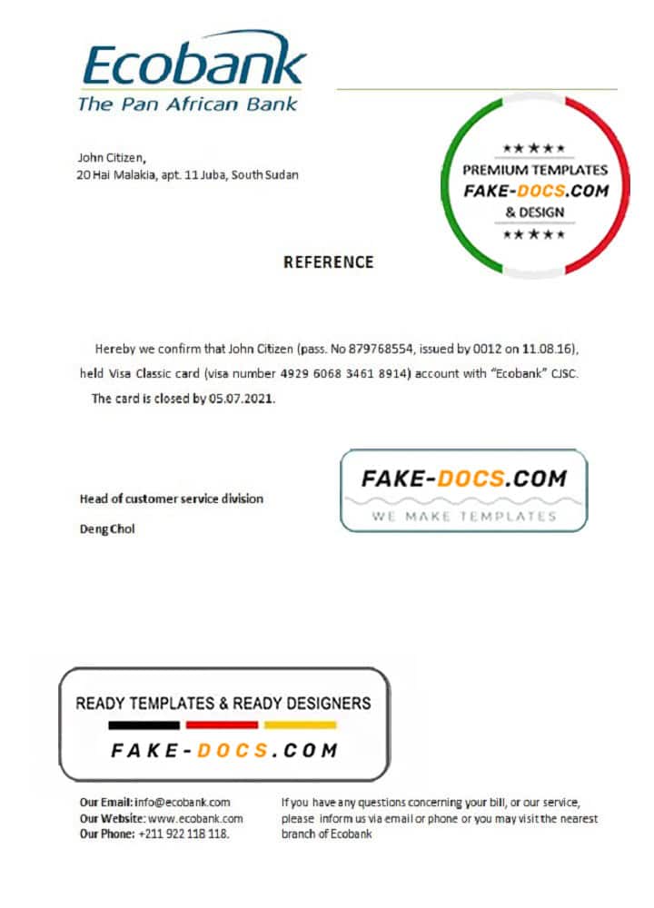 South Sudan Ecobank bank account closure reference letter template in Word and PDF format