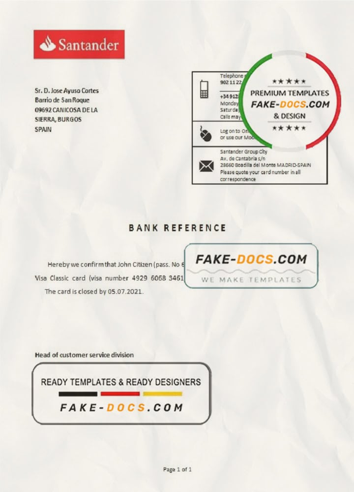 Spain Santander bank account closure reference letter template in Word and PDF format