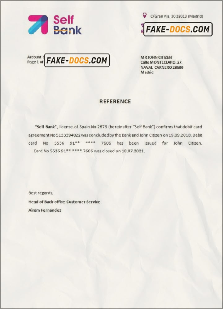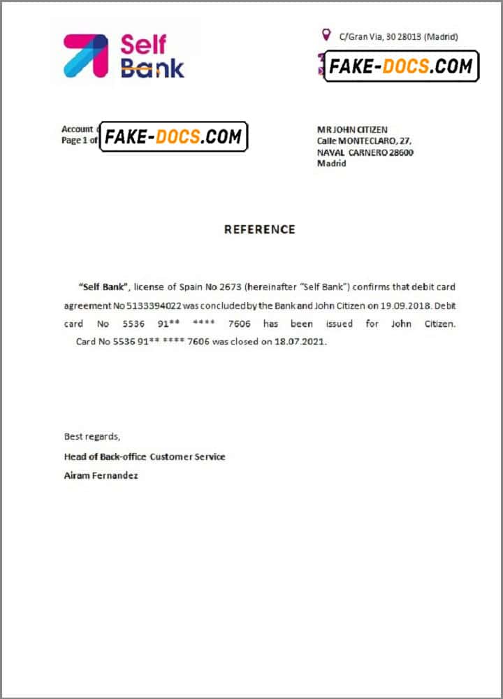 Spain Self Bank bank account closure reference letter template in Word and PDF format