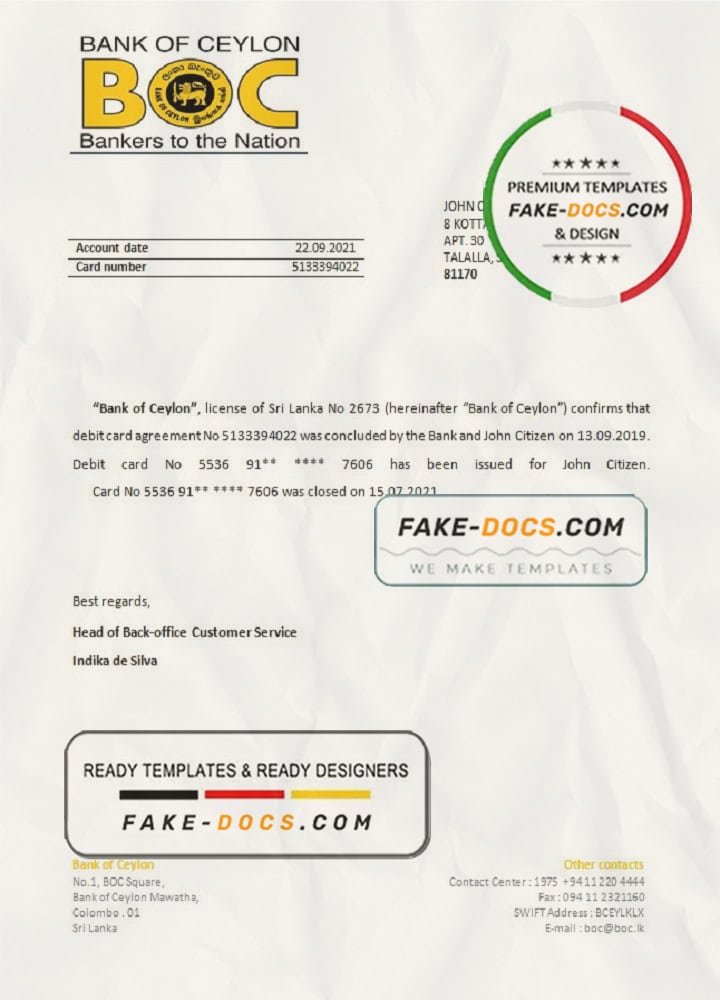 Sri Lanka BOC bank account closure reference letter template in Word and PDF format