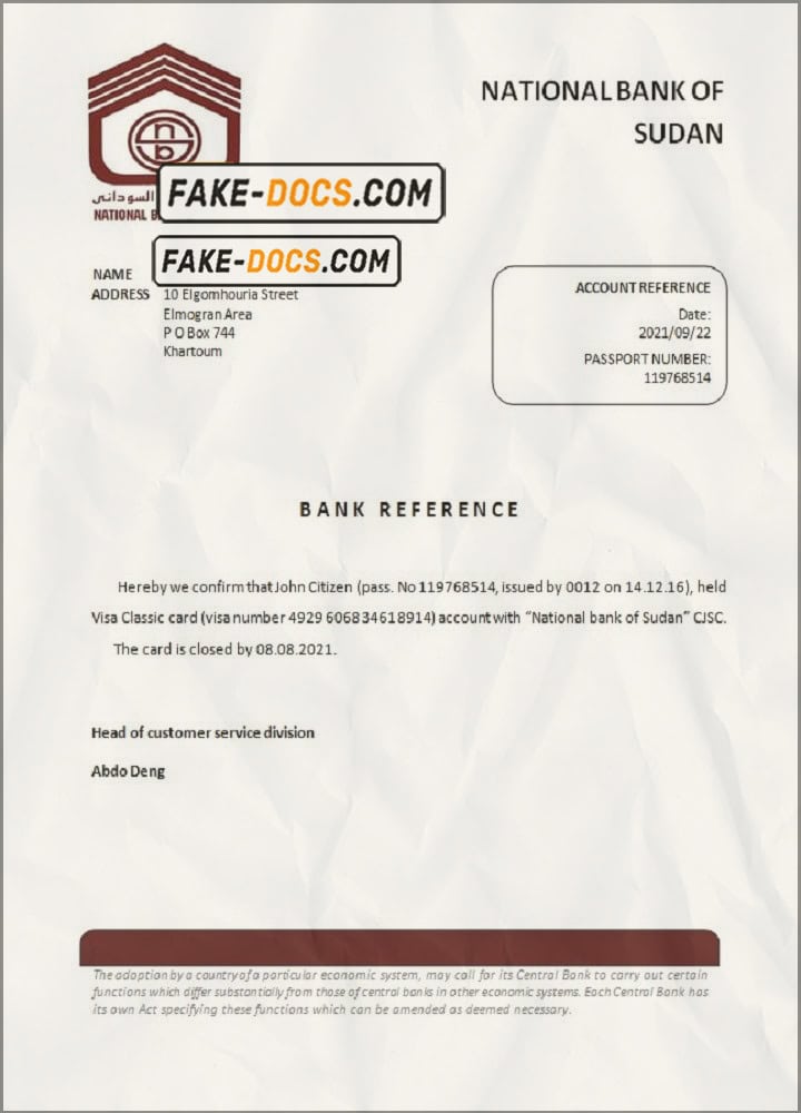 Sudan National Bank of Sudan bank account closure reference letter template in Word and PDF format