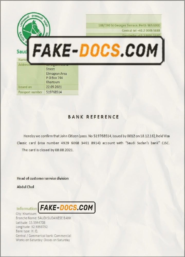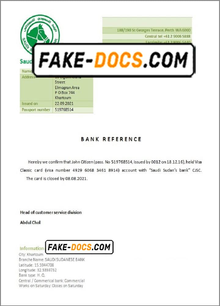 Sudan Saudi Sudan’s Bank bank account closure reference letter template in Word and PDF format