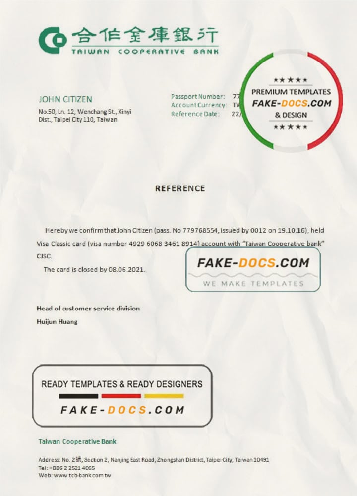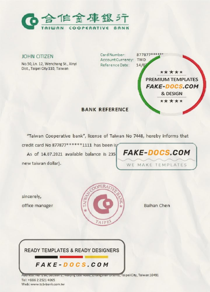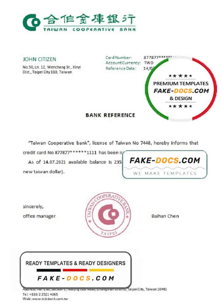 Taiwan Cooperative Bank account reference letter template in Word and PDF format