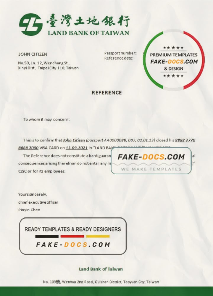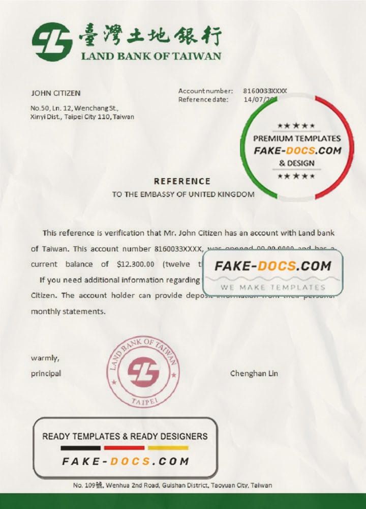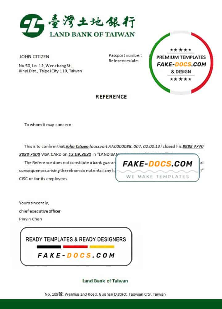 Taiwan Land Bank of Taiwan account reference letter template in Word and PDF format
