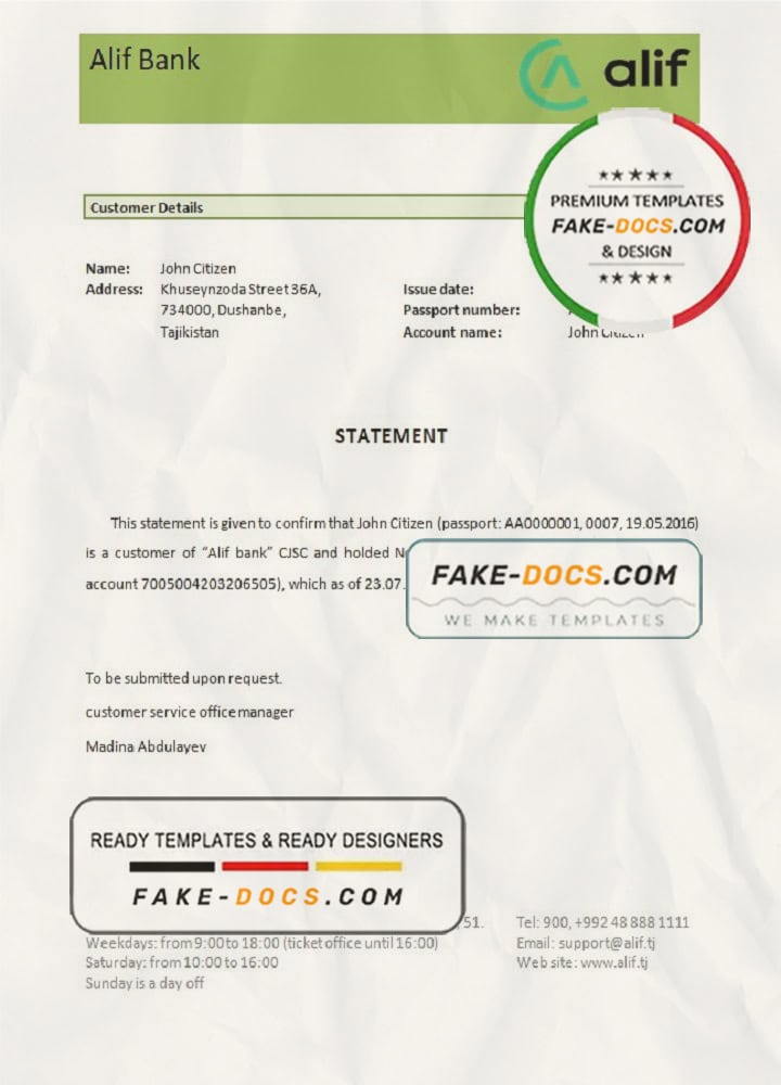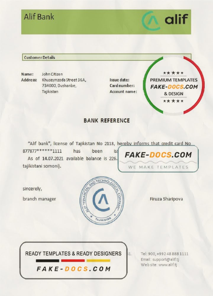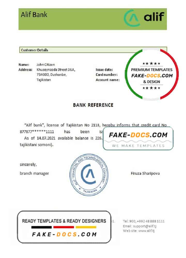 Tajikistan Alif bank reference account reference letter template in Word and PDF format