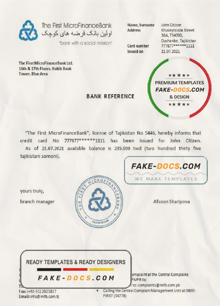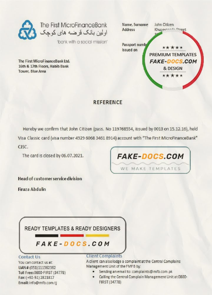 Tajikistan The First MicroFinanceBank reference account reference letter template in Word and PDF format