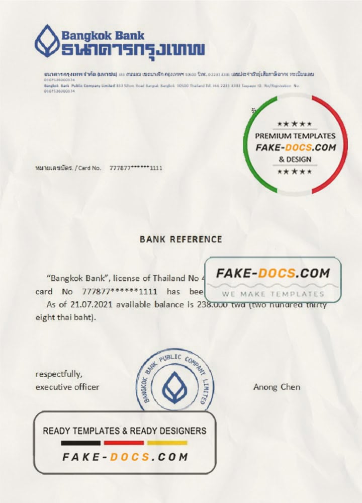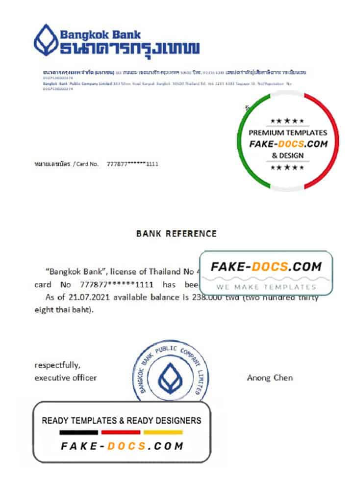 Thailand Bangkok Bank reference account reference letter template in Word and PDF format