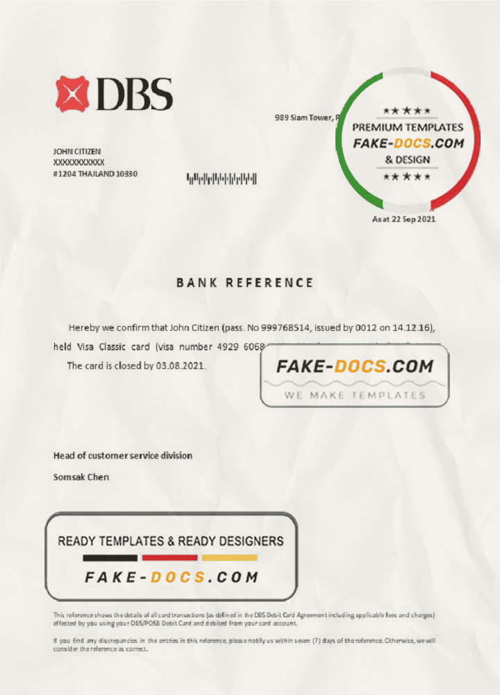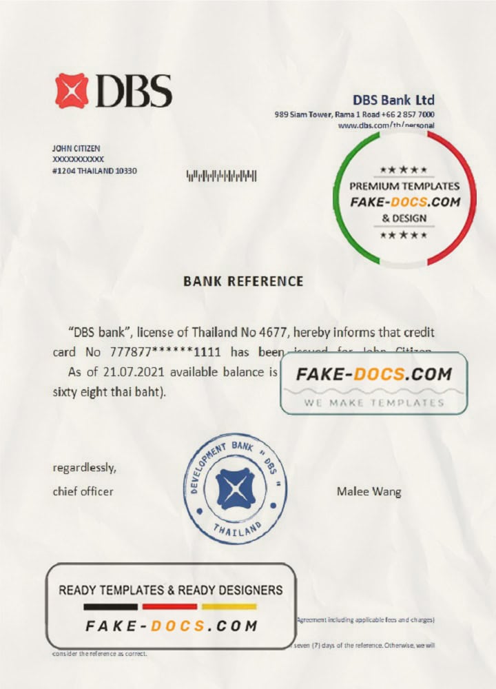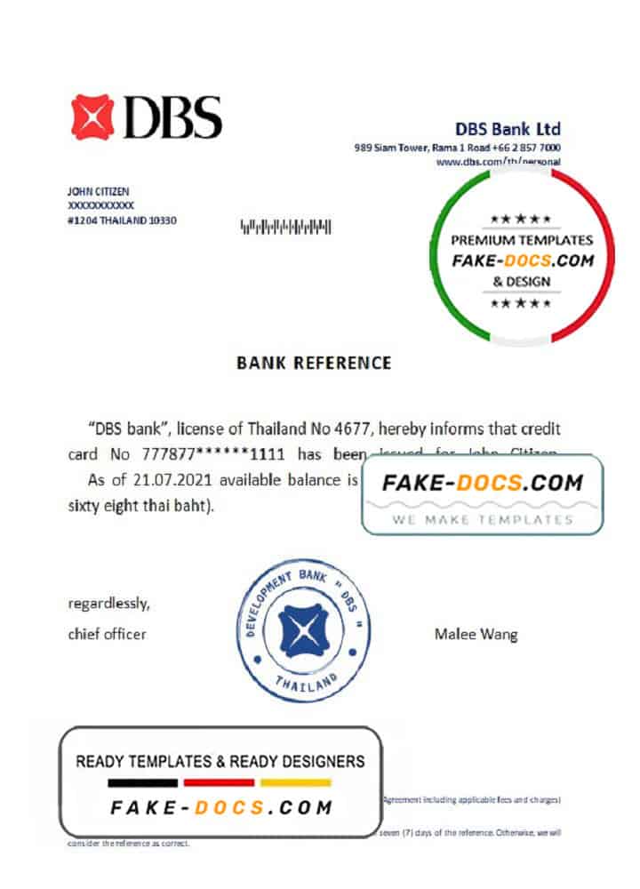 Thailand DBS bank reference account reference letter template in Word and PDF format