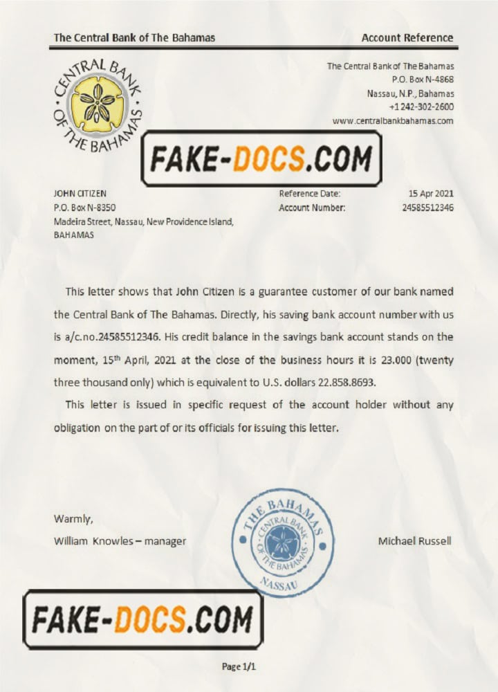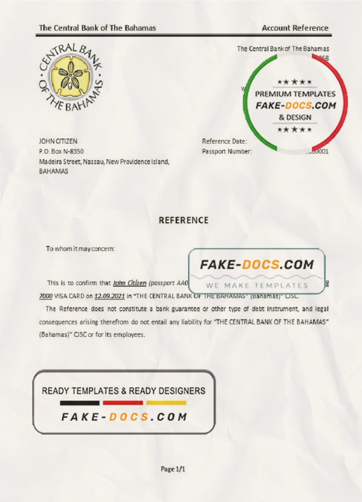 The Bahamas The Central Bank of The Bahamas bank reference letter template in Word and PDF format