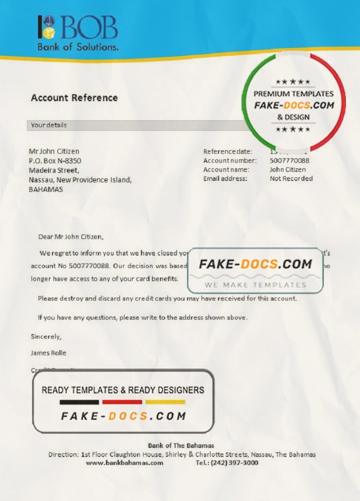 The Bahamas Bank of The Bahamas bank account closure reference letter template in Word and PDF format