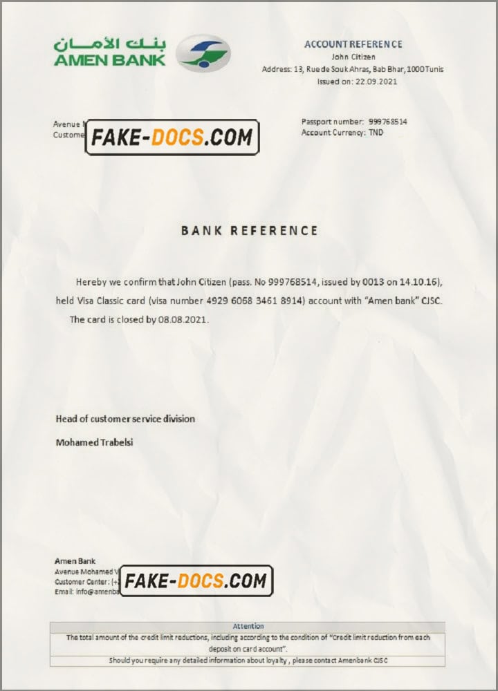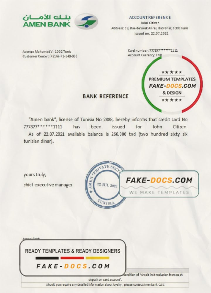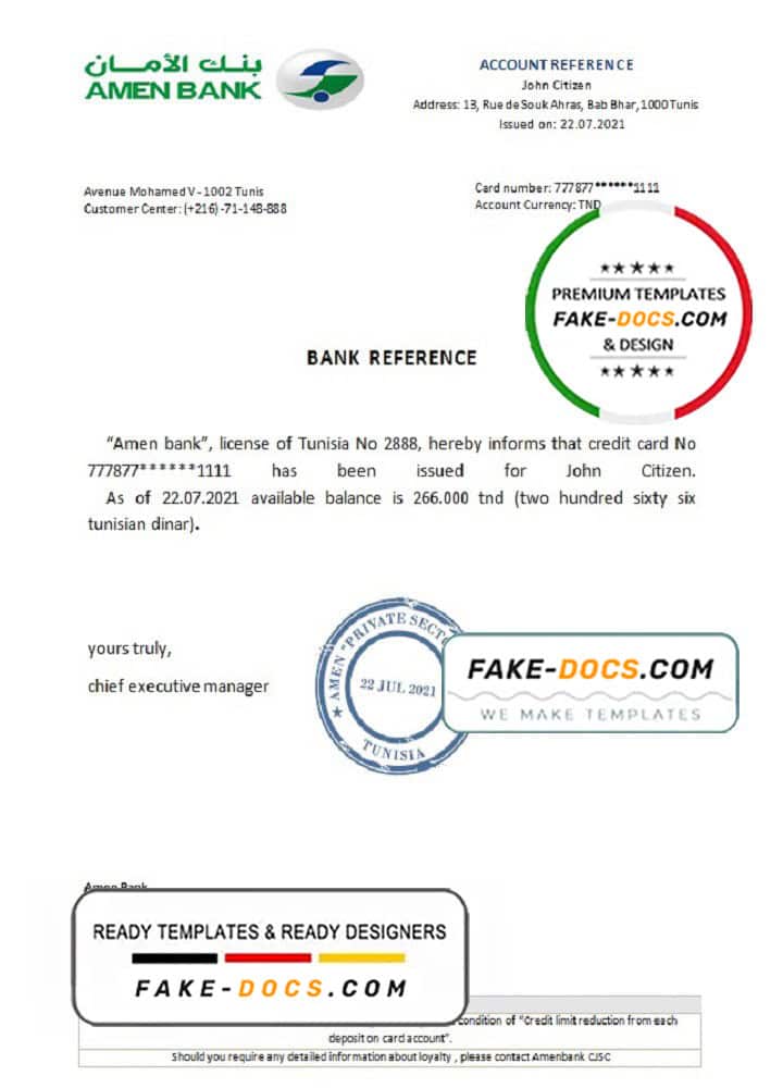 Tunisia Amen bank account balance reference letter template in Word and PDF format