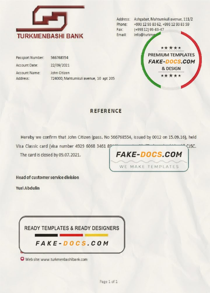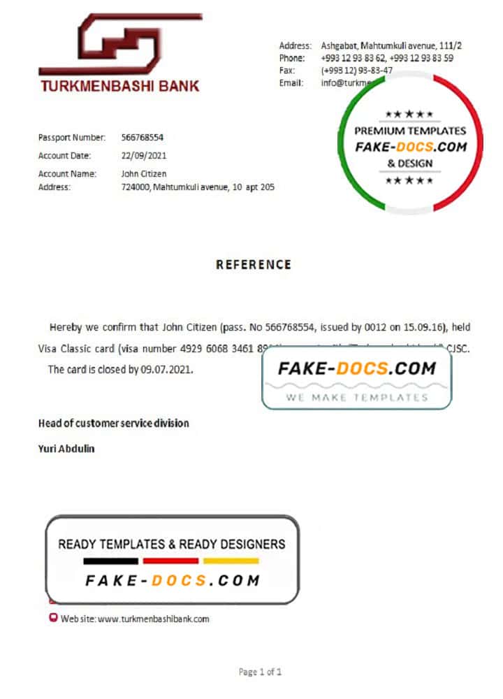 Turkmenistan Turkmenbashi bank account closure reference letter template in Word and PDF format