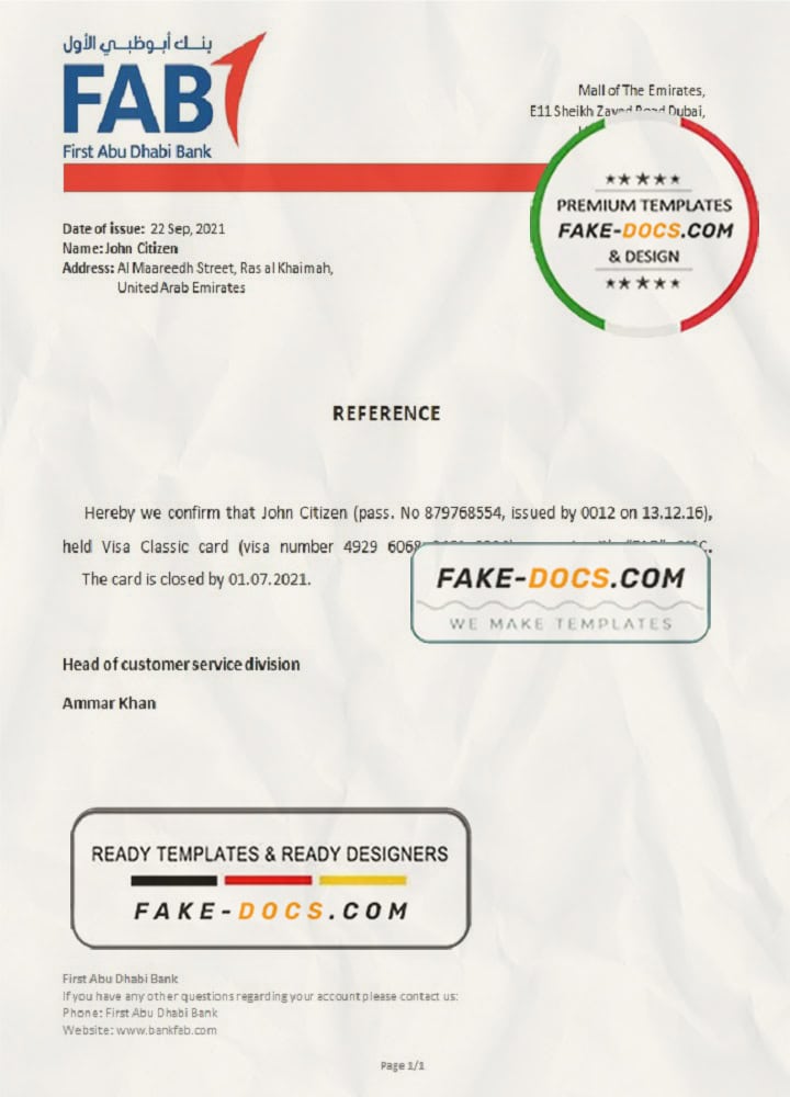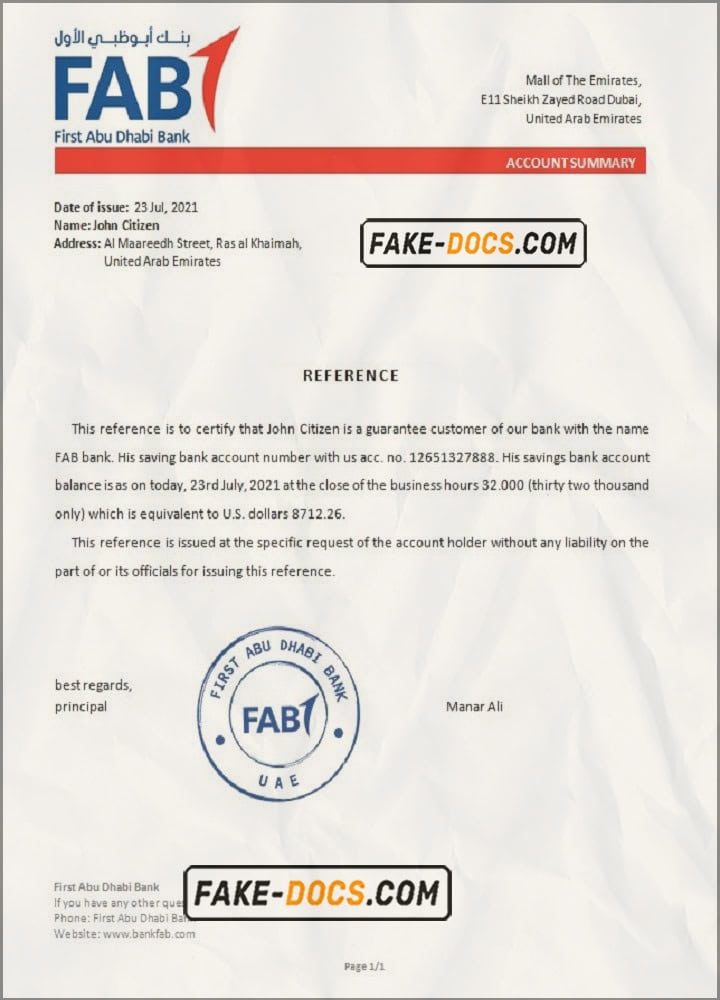 UAE FAB bank account balance reference letter template in Word and PDF format