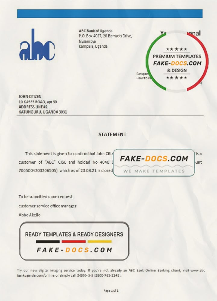 Uganda ABC bank account closure reference letter template in Word and PDF format
