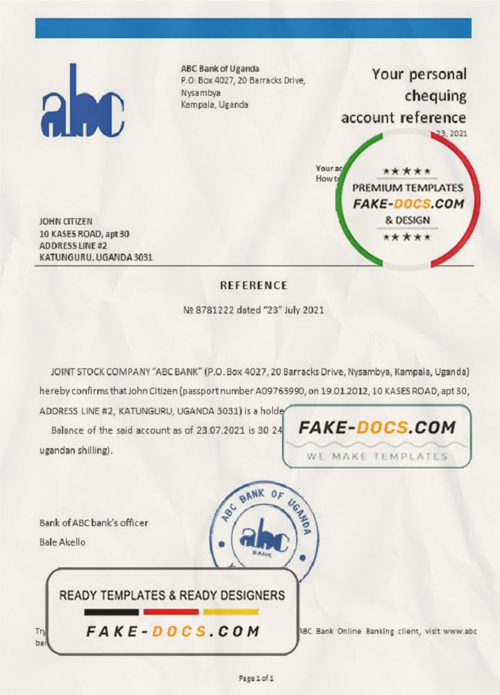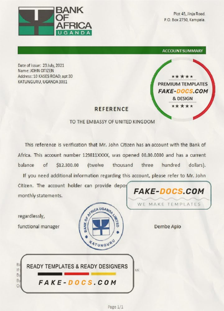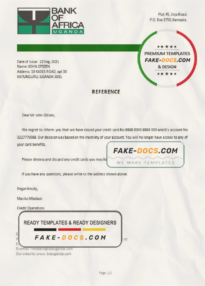 Uganda Bank of Africa account reference letter template in Word and PDF format