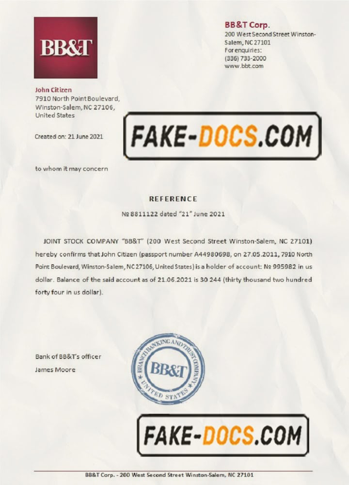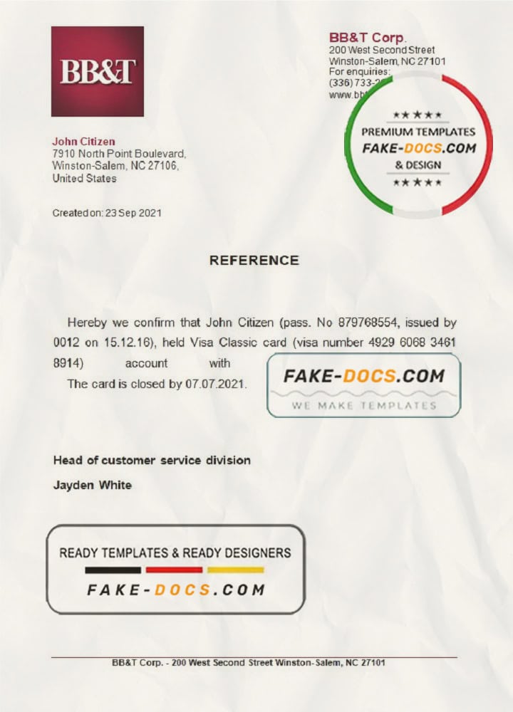 USA BB&T bank account closure reference letter template in Word and PDF format