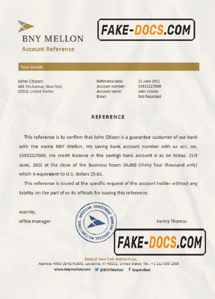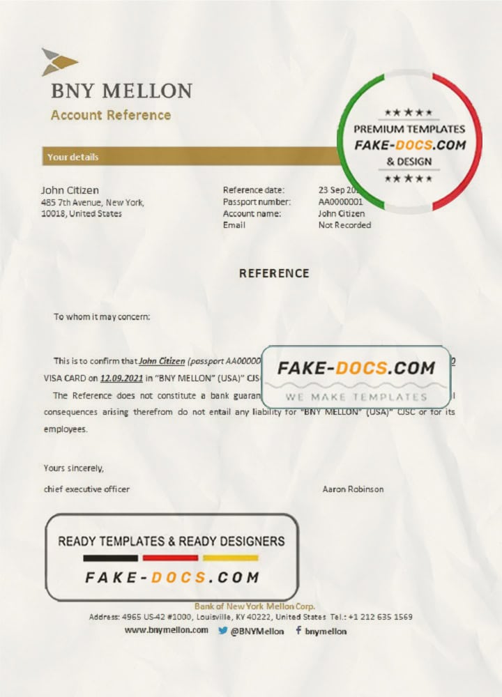 USA BNY Mellon bank account reference letter template in Word and PDF format