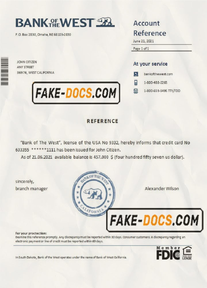 USA Bank of the West bank account reference letter template in Word and PDF format