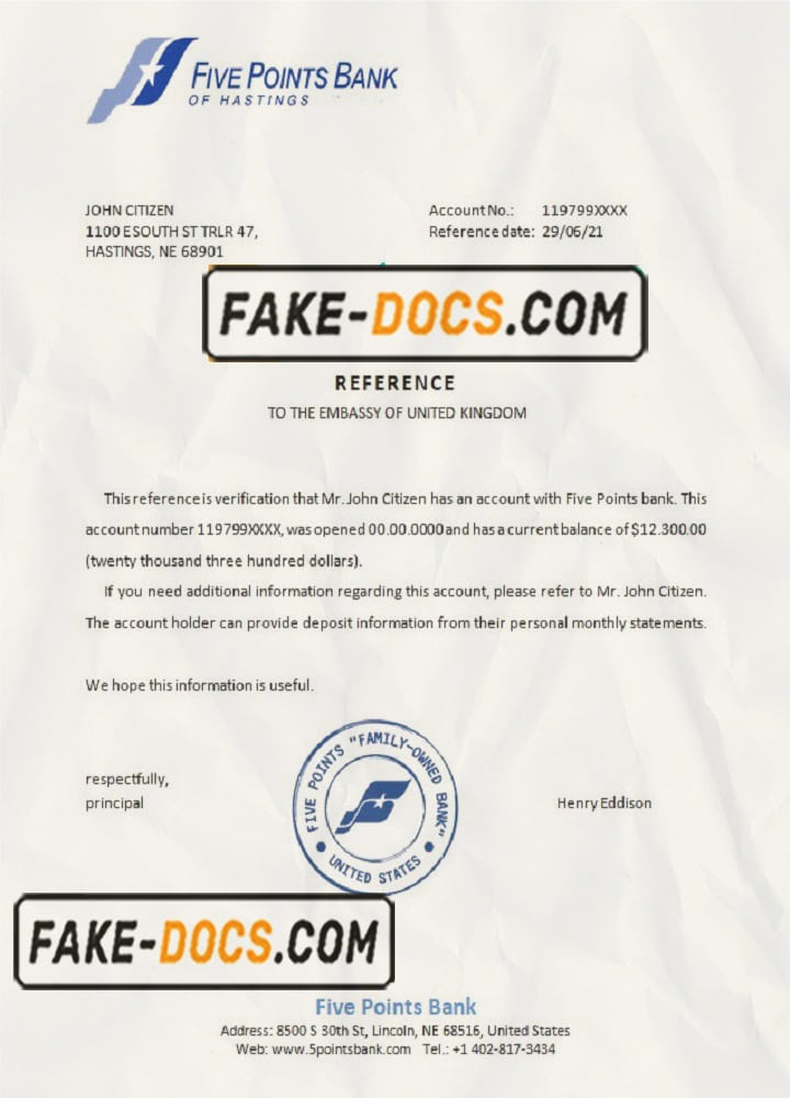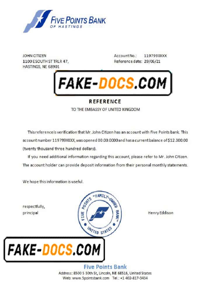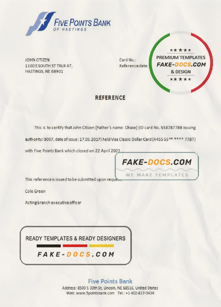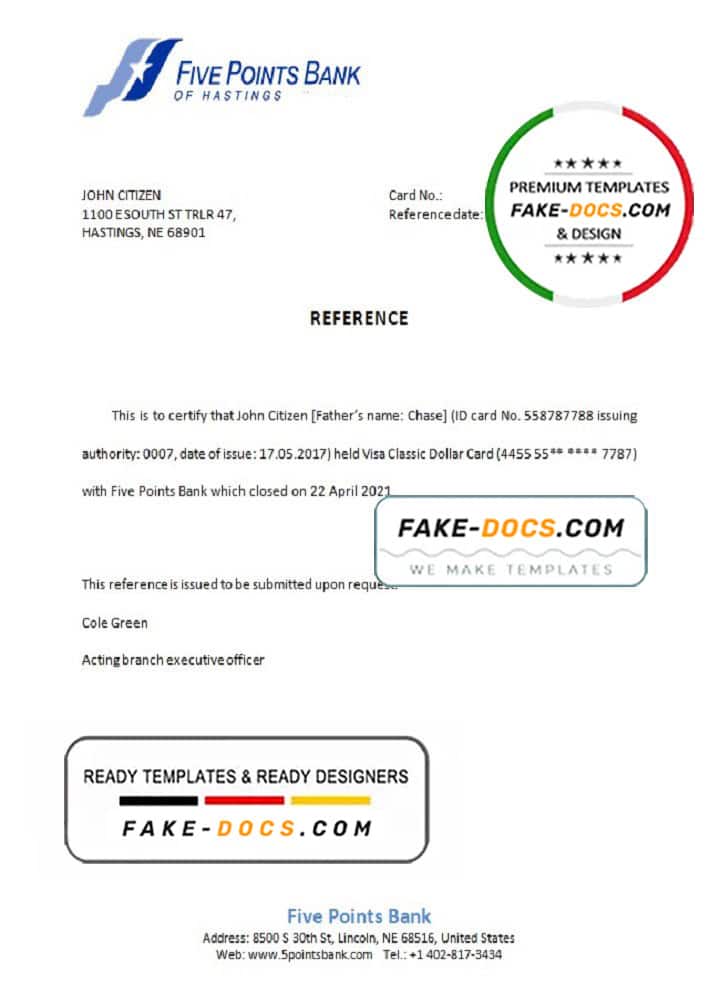 USA Five Points Bank bank account reference letter template in Word and PDF format