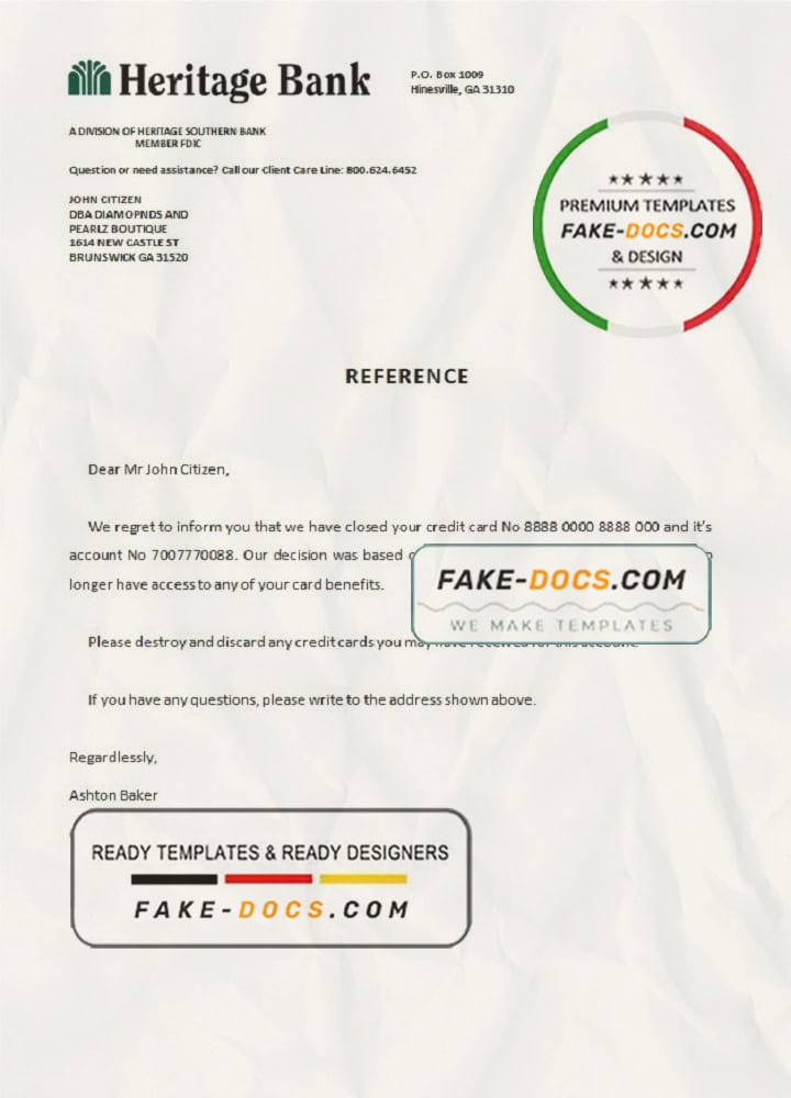 USA Heritage Bank bank account closure reference letter template in Word and PDF format