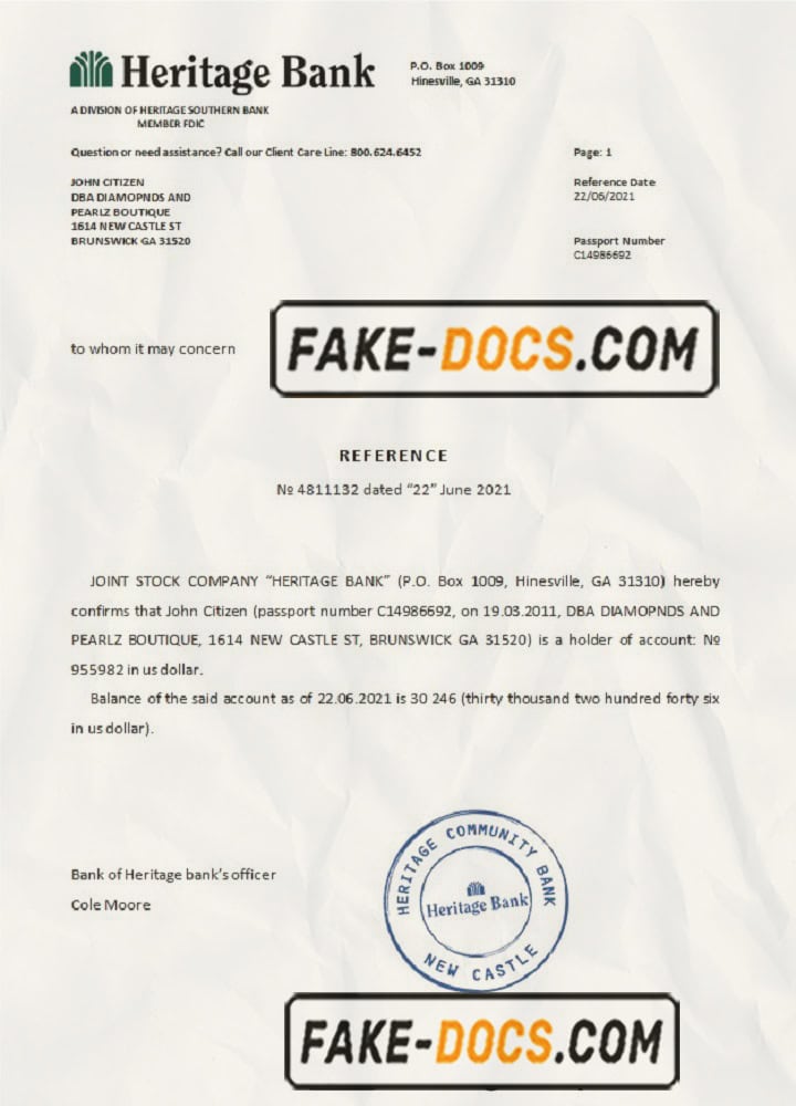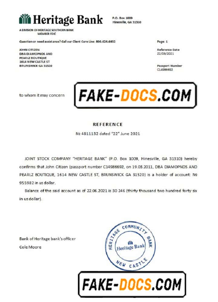 USA Heritage Bank bank account reference letter template in Word and PDF format