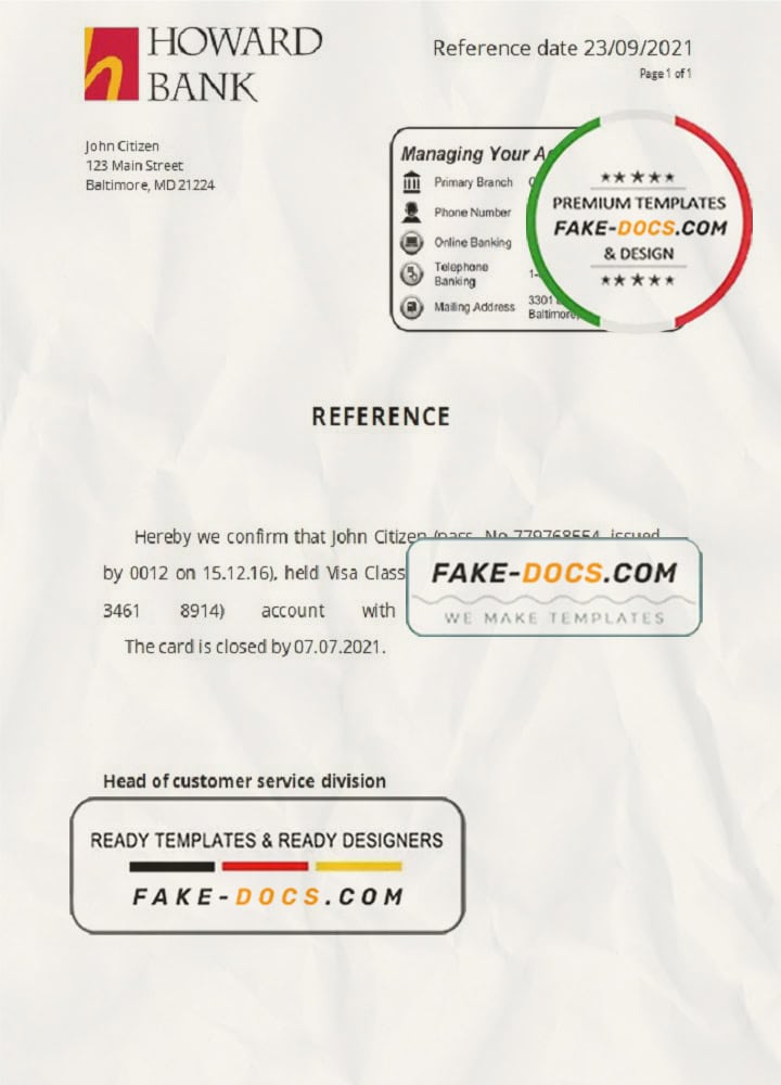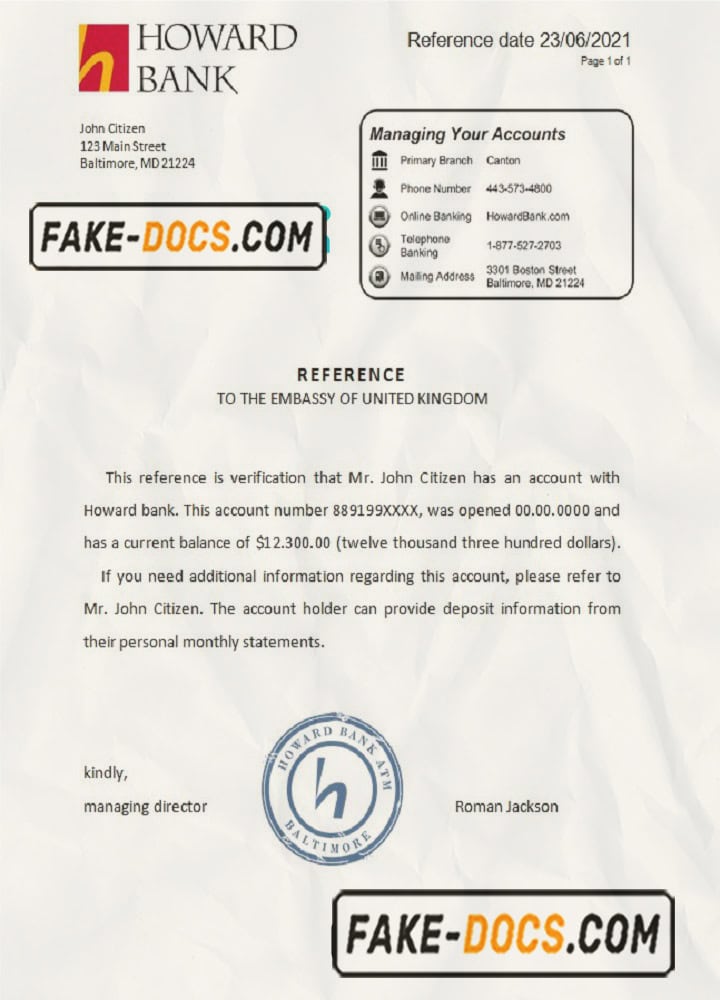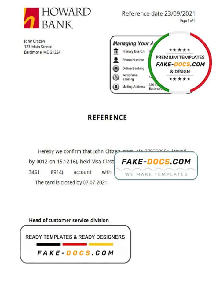 USA Howard Bank bank account reference letter template in Word and PDF format