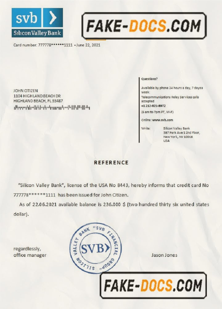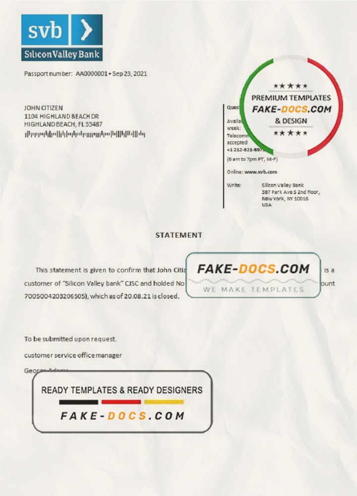 USA Silicon Valley Bank bank account reference letter template in Word and PDF format
