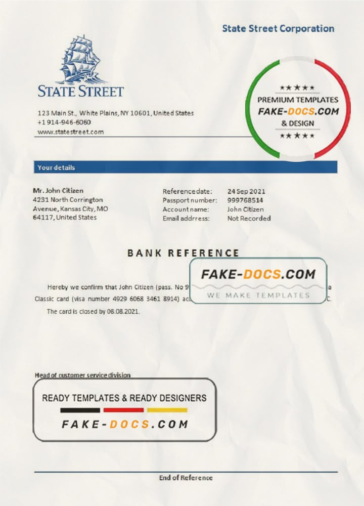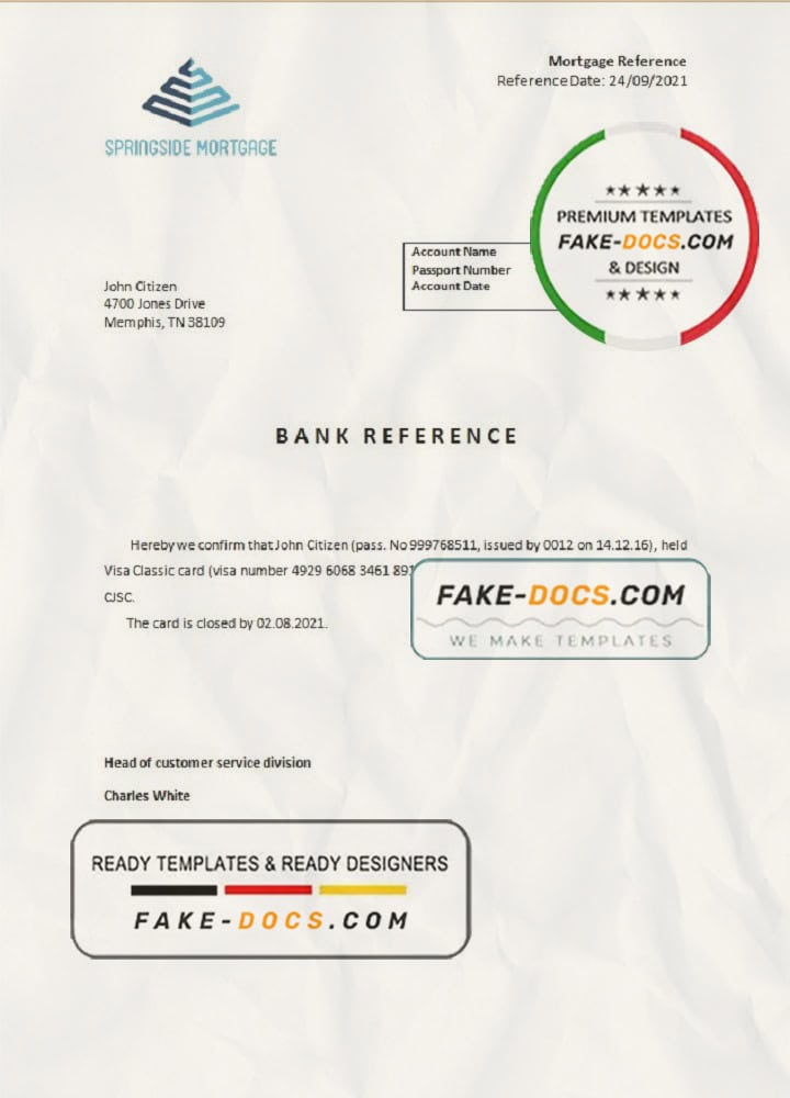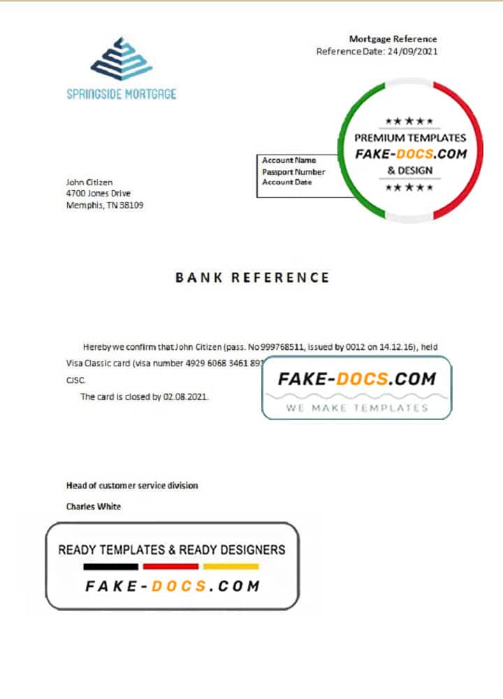 USA Springside Mortgage bank account closure reference letter template in Word and PDF format