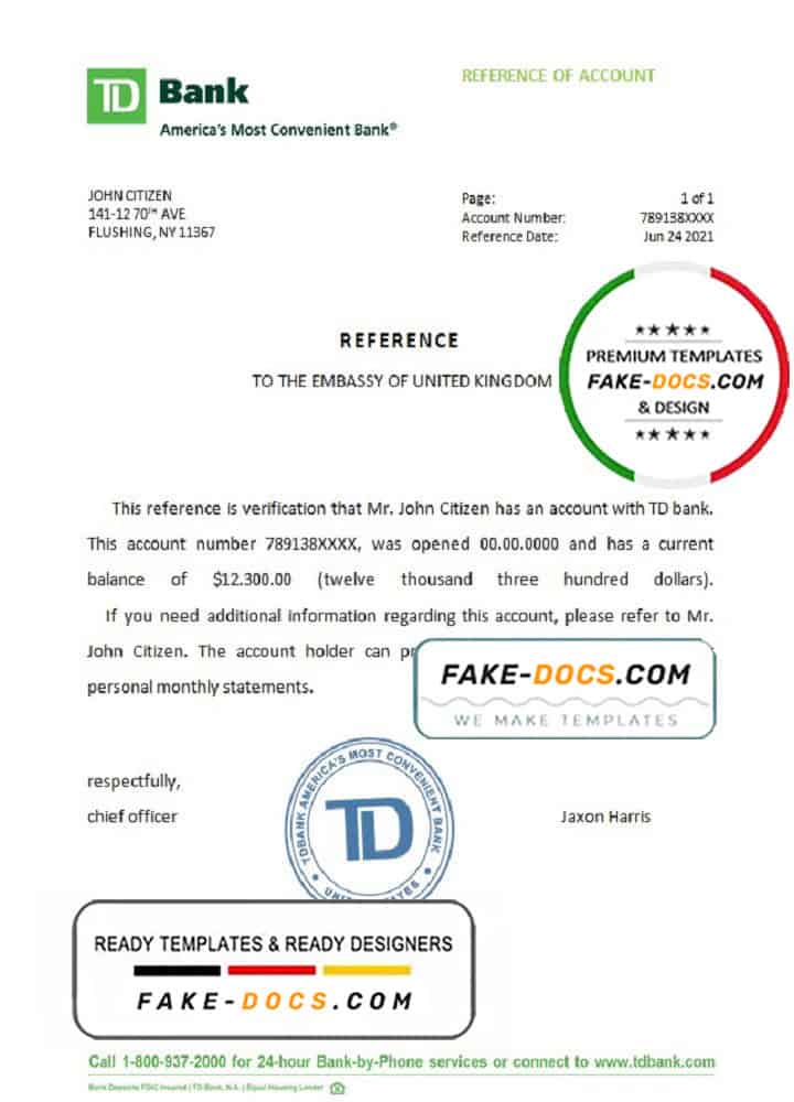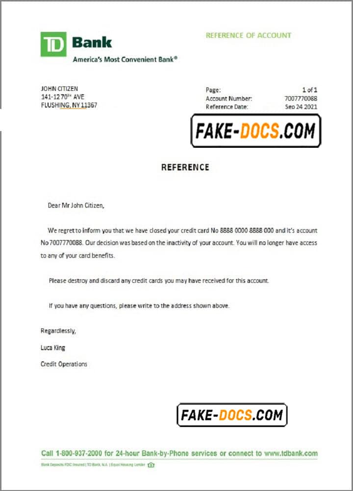 USA TD Bank bank account closure reference letter template in Word and PDF format