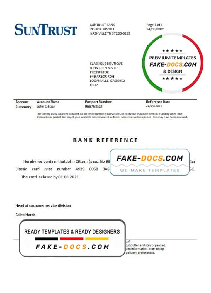 USA SunTrust bank account closure reference letter template in Word and PDF format