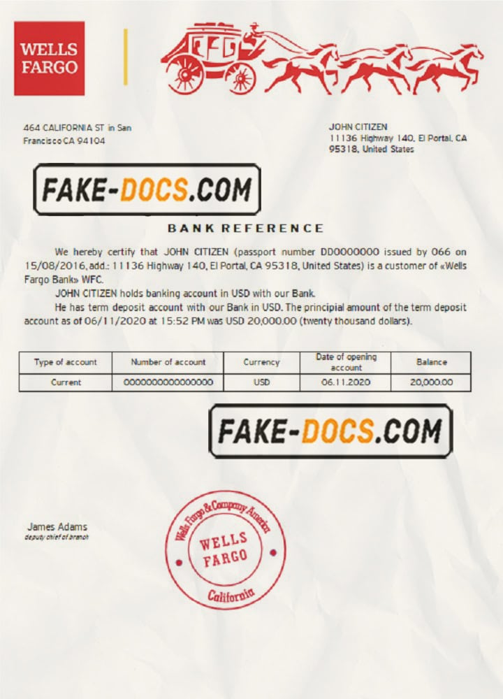 USA Wells Fargo Bank account reference letter template in Word and PDF format